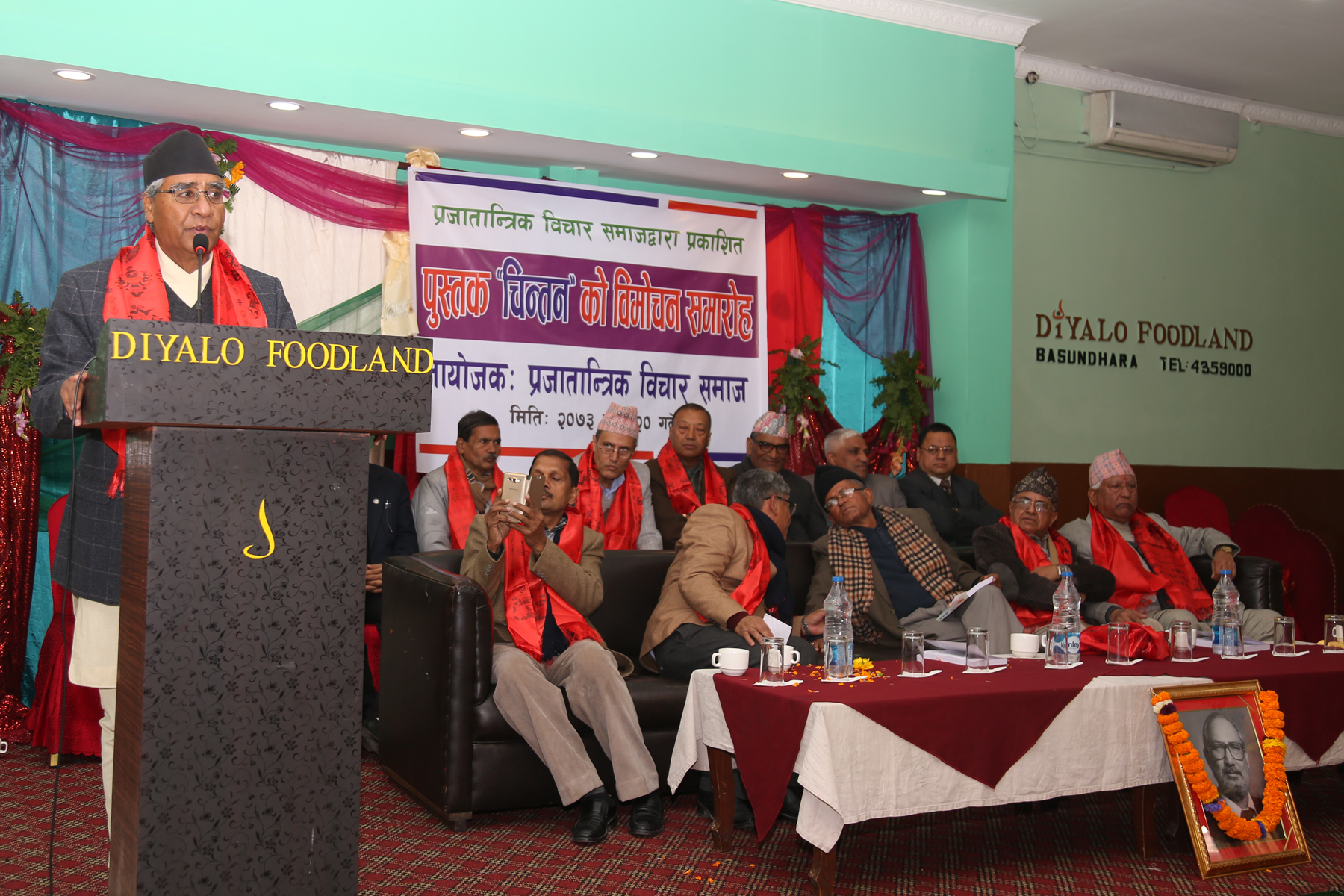 मुलुकका सबै दल प्रजातान्त्रिक पद्धतिमा आइसके पनि पूर्ण प्रजातान्त्रिक हुन नसकेको उनको भनाइ थियो । उनले नेपालमा भएका प्रजातान्त्रिक उपलब्धिलाई जनतामाझ चिनाउन प्रजातान्त्रिक विचार समाजको ठूलो योगदान रहेको उल्लेख गरे ।