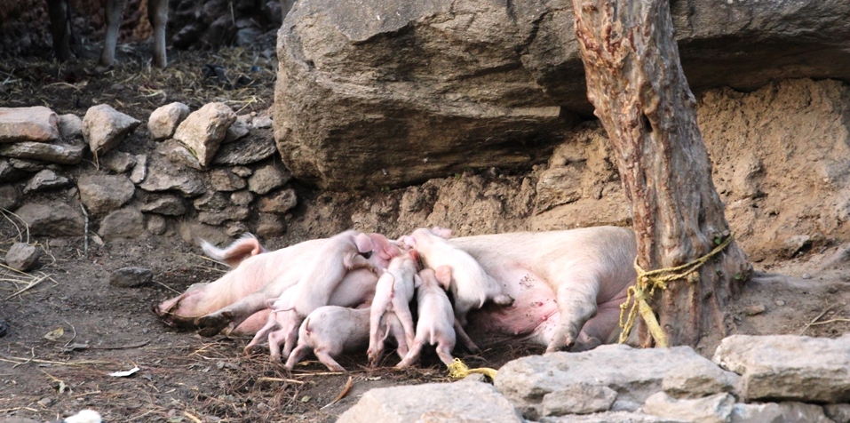 दैलेखको रार्कमकर्णालीमा ब्यवसायीक रुपमा पालिएको आमा बगुरले छाउडाहरुलाई दुध खुवाउँदै । रुढीबाजी चलनका कारण नपाल्ने गरिएपनि अहिले यहाँका धेरै जसो ब्यवसायीहरुले बगुर पाल्ने गर्दछन् ।