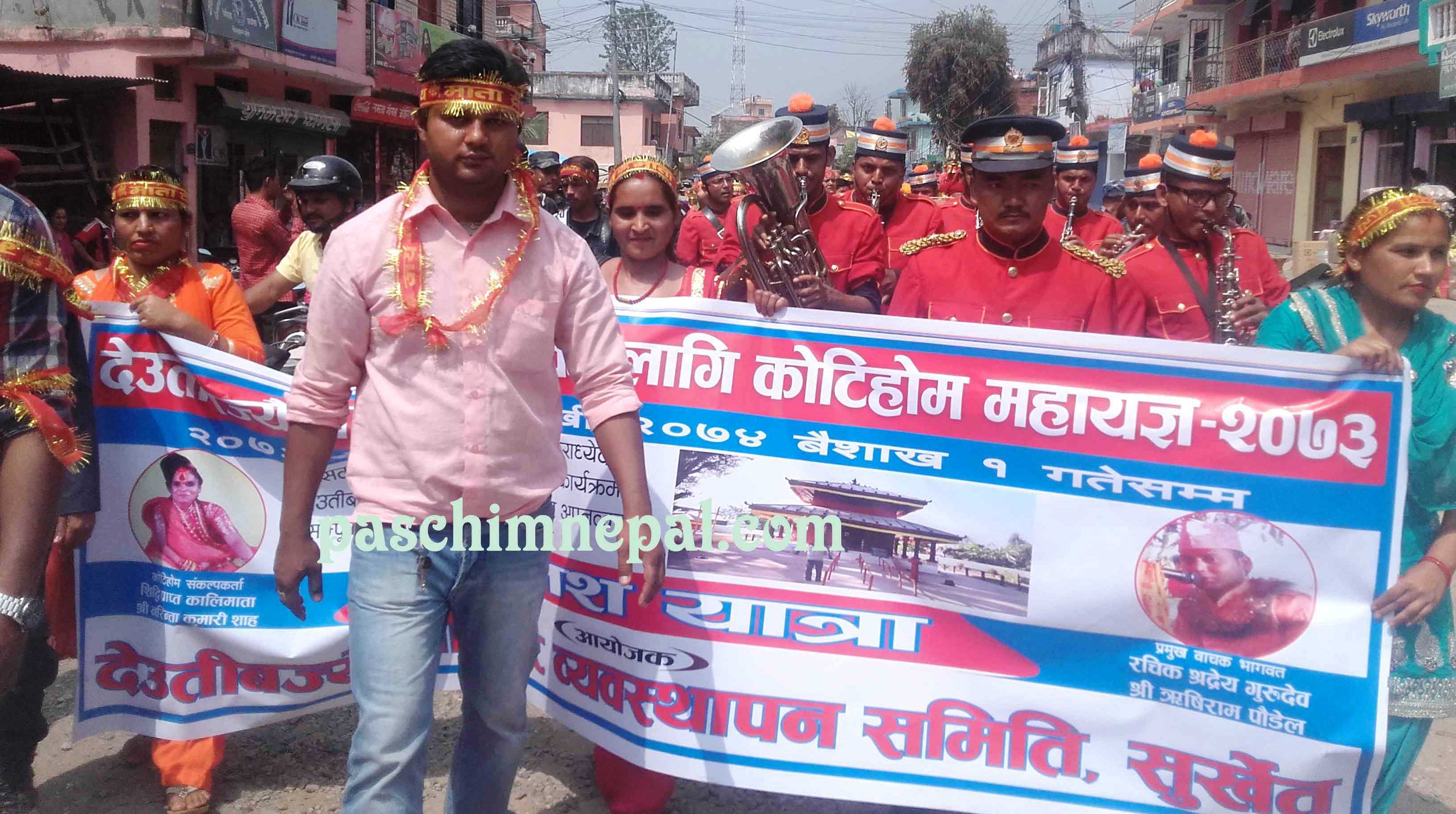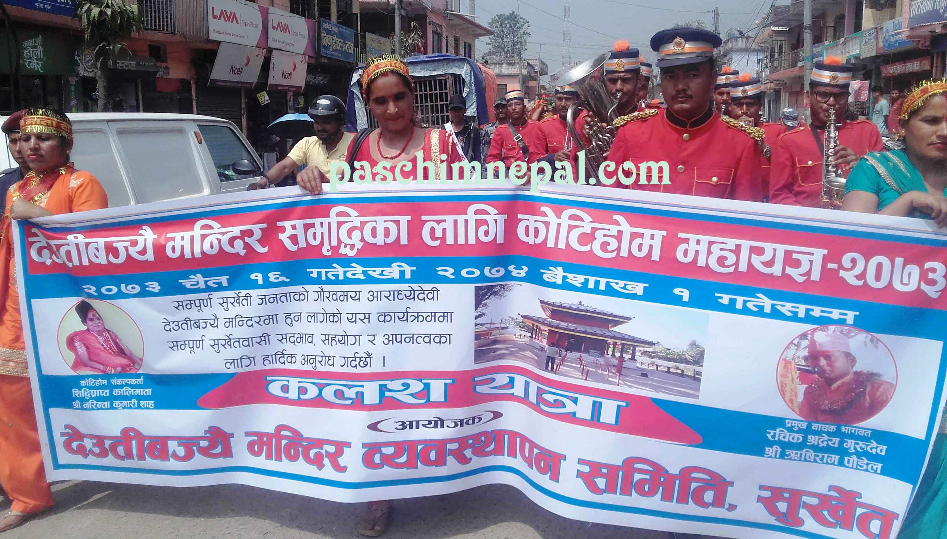 सुर्खेत । सुर्खेतको धरोहर देउती बज्यै मन्दिरमा बुधबारदेखी कोटीहोम महायज्ञ शुरु भएको छ । देउती बज्यै मन्दिर व्यवस्थापन समितिको आयोजना शुरु भएको महायज्ञको पहिलो दिन बुधवार कलश यात्रा निकालिएको थियो ।