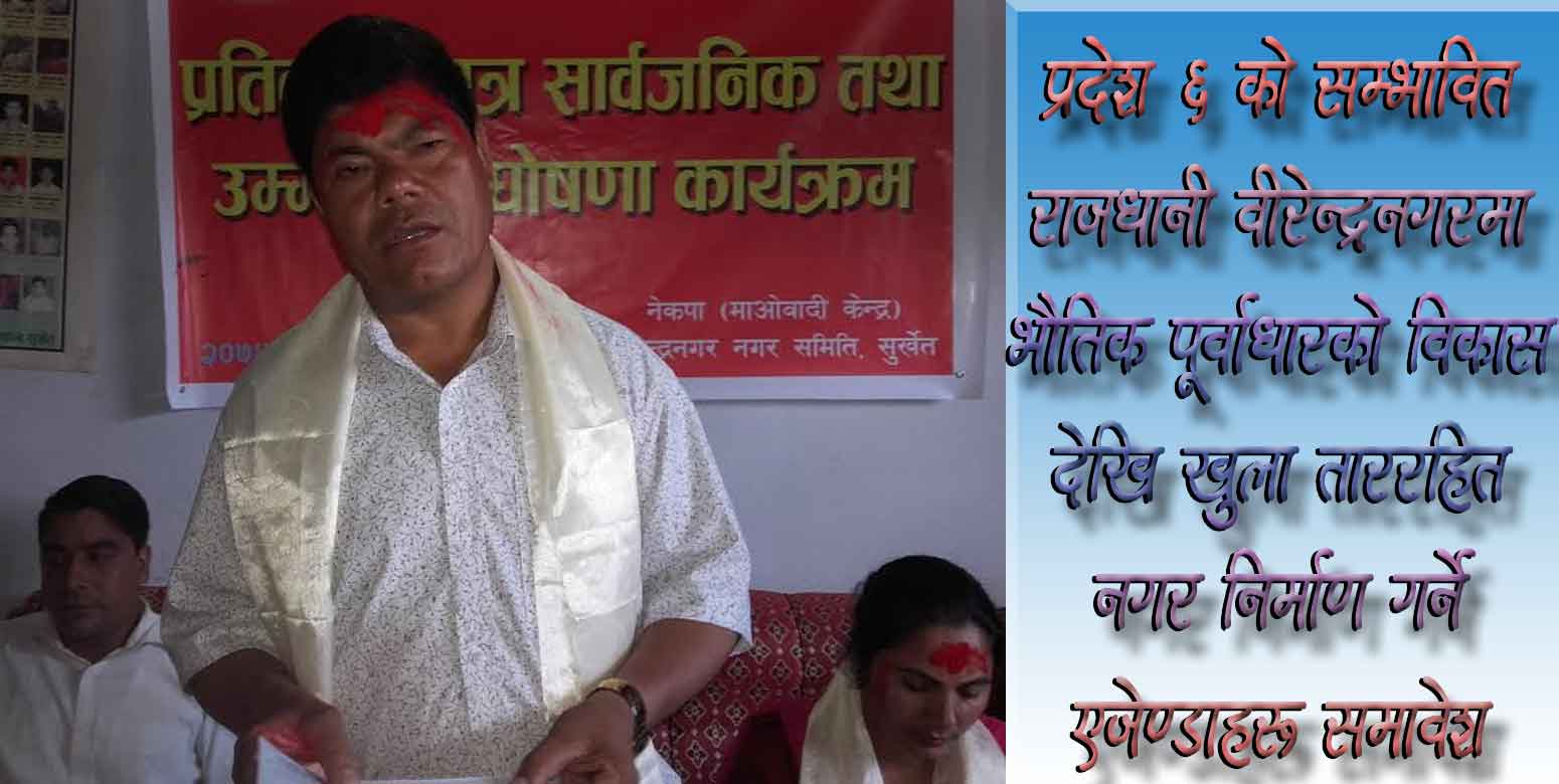 सुर्खेत । नेकपा माओवादी केन्द्र वीरेन्द्रनगर नगर कार्यसमितिले सुन्दर, समुन्नत र समृद्ध वीरेन्द्रनगरको परिकल्पना प्रतिवद्धता सार्वजनिक गरेको छ । नगर कार्यसमितिले प्रदेश ६ को सम्भावित राजधानी वीरेन्द्रनगरमा भौतिक पूर्वाधारको विकासदेखि खुला ताररहित नगर निर्माण गर्ने एजेण्डाहरु सामावेश गरेको छ ।