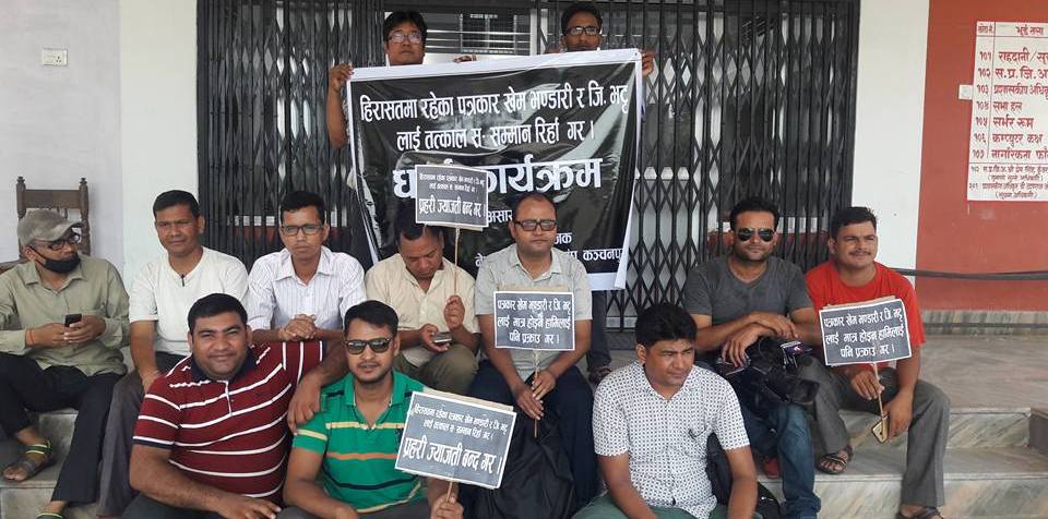 बिहान १० बजेदेखि पत्रकारहरु नेपाल पत्रकार महासङका केन्द्रिय सदस्य प्रकाशबिक्रम शाहको अगुवाइमा धर्नामा बसेका हुन । समाचार लेखेकै भरमा पुर्बाग्रही भएर प्रहरीले पत्रकारलाई पक्राउ गरेको भन्दै पत्रकार धर्नामा बसेको केन्द्रिय सदस्य प्रकाश बिक्रम साहले जानकारी दिए । पक्राउ परेका पत्रकारको रिहाई नभएसम्म धर्ना नछाडने पत्रकारले बताएका छ्न ।