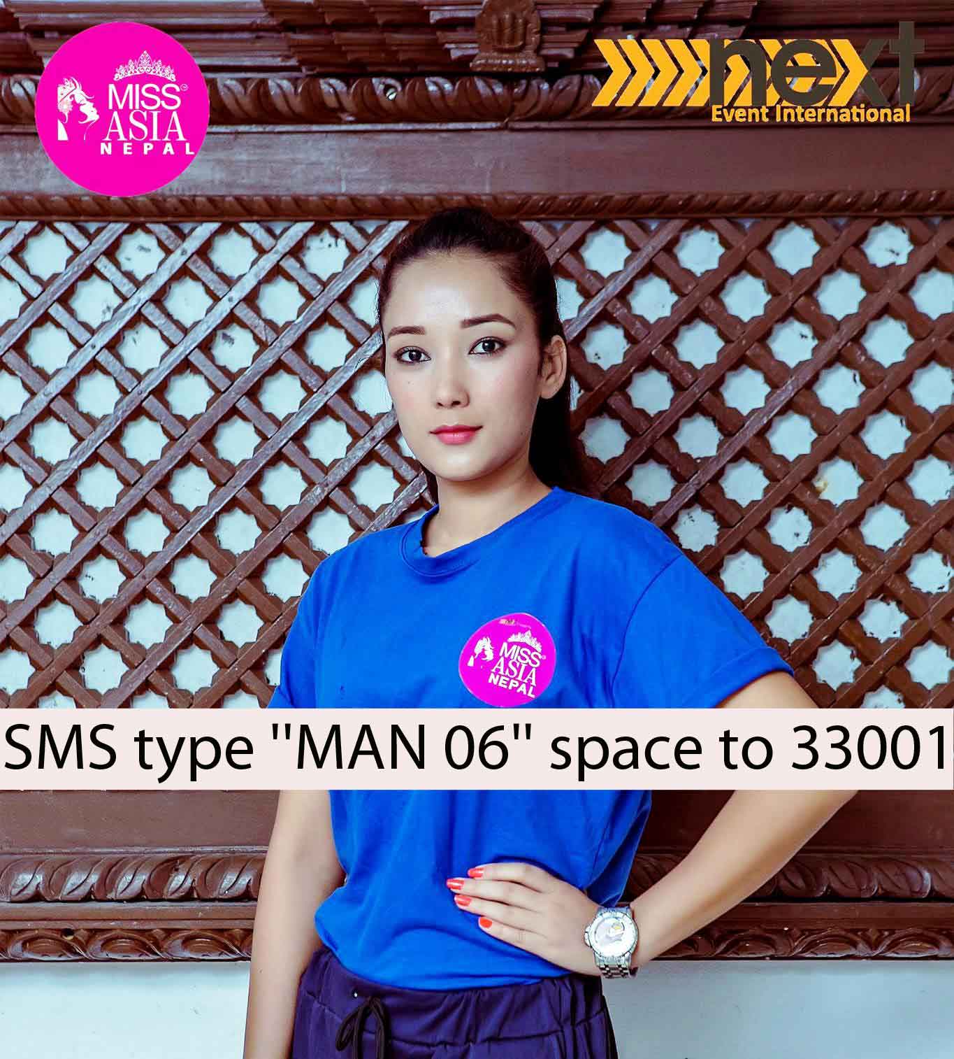सुमनलाई जिताउन मोवाइल वक्समा गएर Type ”MAN 06” space to 33001 मा म्यासेज गर्न सकिन्छ । काठमाडौंमा जारी रहेको मिस एशिया नेपालको अन्तिम अवार्ड प्रतियोगिता असार ३१ गते हुँदैछ ।