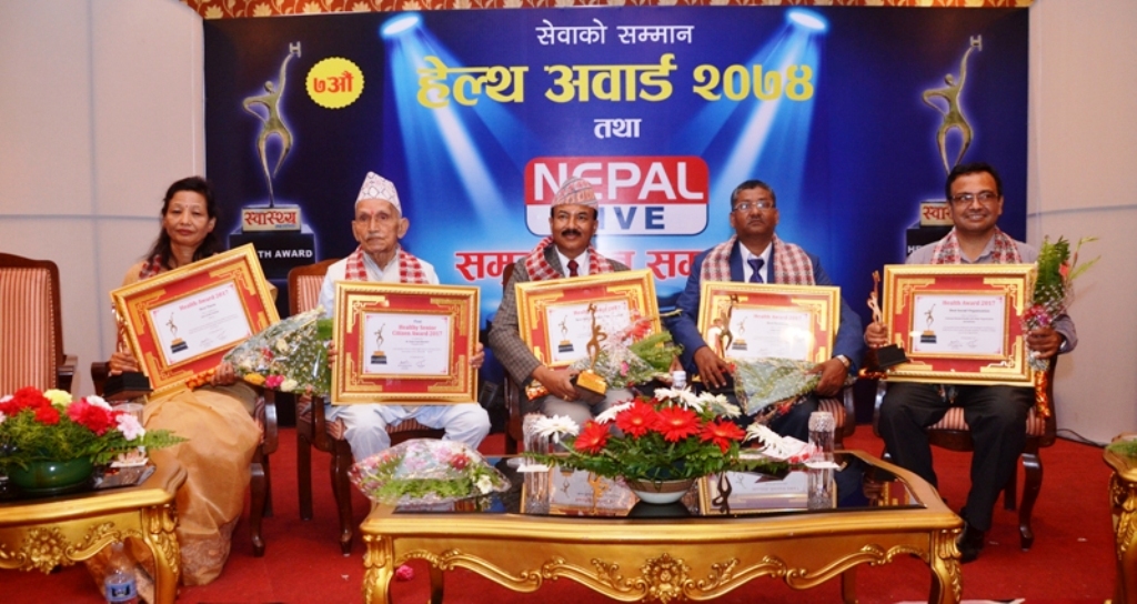 काठमाडाैँ । स्वास्थ्य खबरपत्रिकाले प्रदान गर्दै आएको हेल्थ अवार्ड २०७४ बाट चिकित्सक, नर्स, स्वास्थ्यकर्मी, स्ययंसेविका, अस्पताल, सामाजिक संस्था र स्वस्थ ज्येष्ठ नागरिक सम्मानित भएका छन् ।