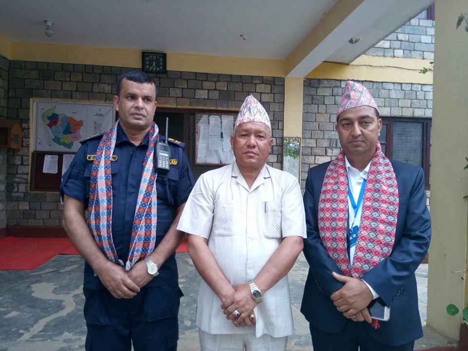 नयाँ आएका डिएसपी सरोज पौडेल र प्रमुख जिल्ला अधिकारी विश्वराज न्यौपालेलाई जिल्ला संमन्वय समितिका प्रमुख प्रेमबहादुर थापाले शान्ति सुरक्षा र अमनचैन प्रभावकारी बनाई राख्न सुझाव दिएका छन् ।