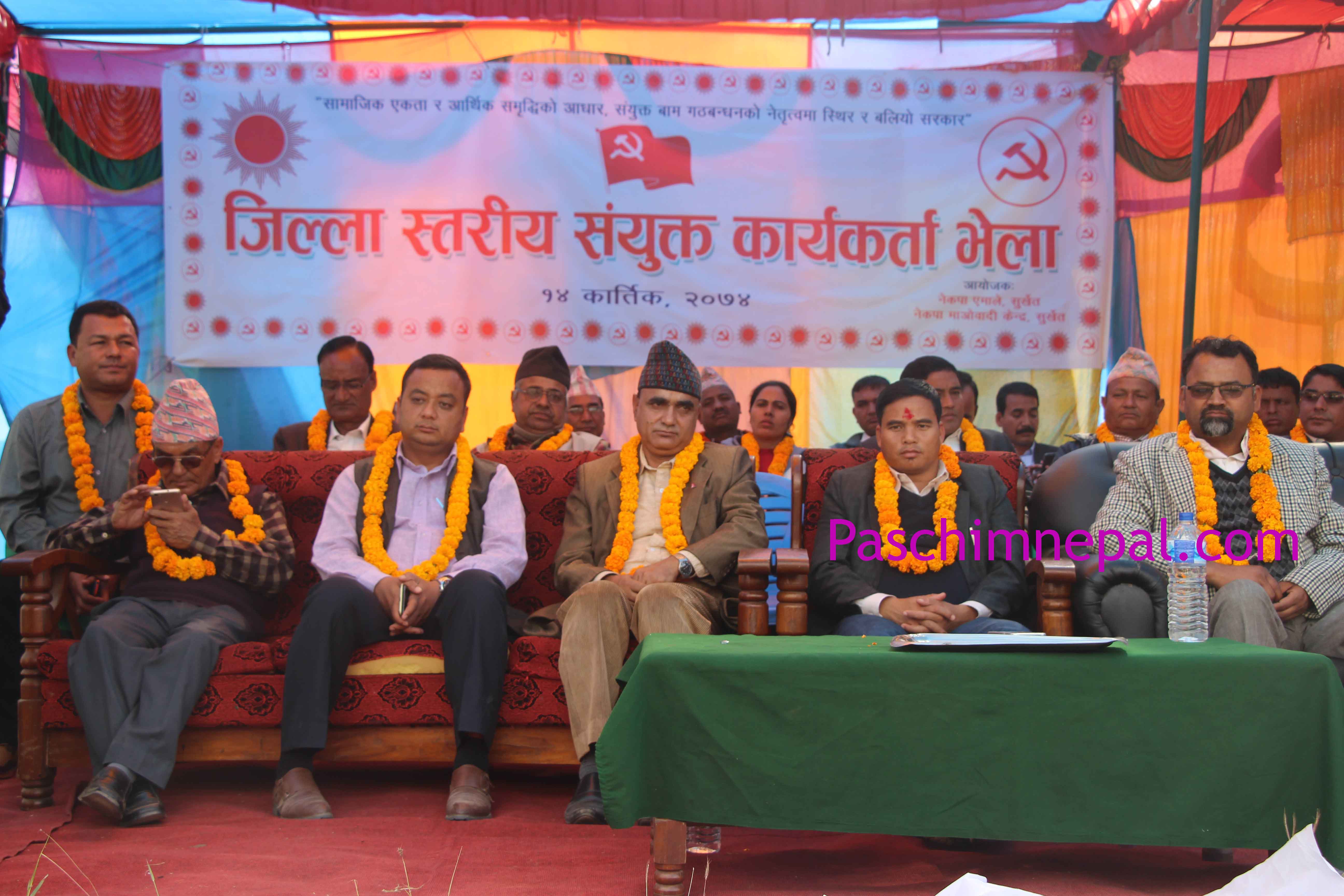 संयुक्त भेलामा नेकपा एमाले र माओवादी केन्द्रका जिल्ला तथा केन्द्रिय नेताहरुले सम्बोधन गरेका थिए । प्रतिनीधि सभाका लागि २ र प्रदेश सभाका लागि ४ निर्वाचन क्षेत्र रहेको सुर्खेतमा स्थानीय तहको मत परिणाम अनुसार लोकतान्त्रिक गठबन्धनभन्दा बाम गठबन्धन १५ हजार ७८९ मतले अघि छ । वाम गठबन्धनको ७१ हजार ७७० मत र लोकतान्त्रिक गठबन्धनको ५५ हजार ९८१ मत छ ।