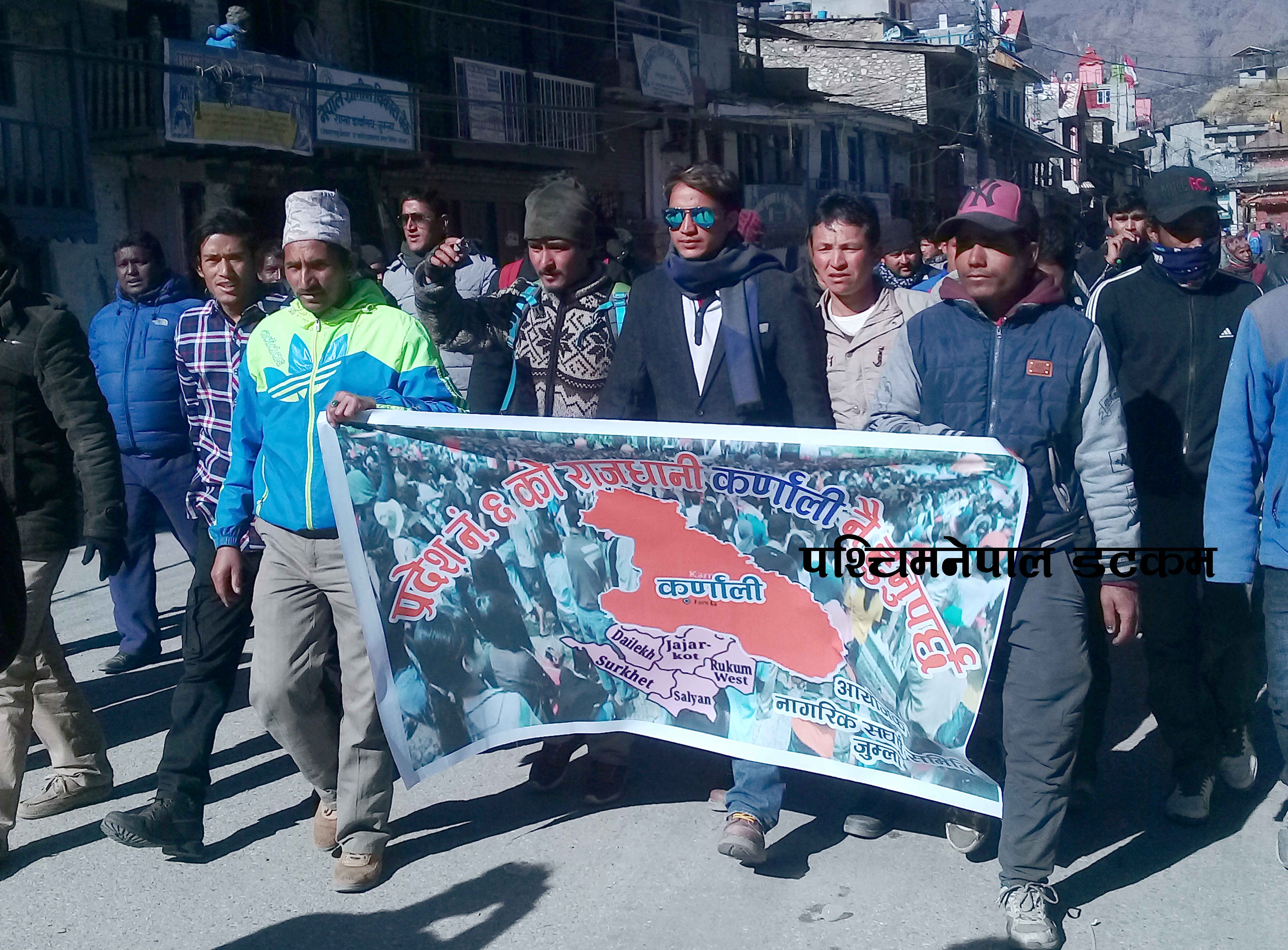 जुम्ला । देशभर प्रदेशको राजधानी माग्दै आन्दोलन चलिरहेका बेला जुम्लामा पनि विहिबारदेखि ६ नम्बर प्रदेशको राजधानी कर्णालीमा नै हुनु पर्ने माग गर्दै प्रर्दशन शुरु भएको छ । नागरिक संघर्स समिति जुम्लाको आयोजना तथा पत्रकार महासंघ जुम्लाको सहकार्यमा प्रर्दशन शुरु गरिएको हो ।