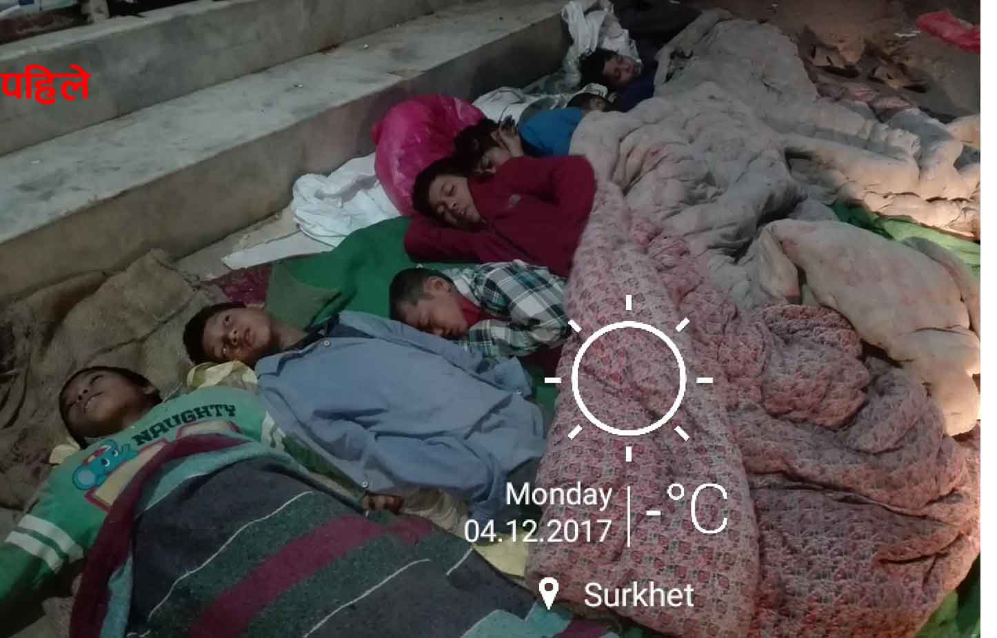 सुर्खेत । वीरेन्द्रनगर नगरपालिका क्षेत्रमा सडकको चिसोमा दिनरात विताउने १७ बालकहरु न्यायो कपडा सहित सुरक्षित स्थानमा पुगेका छन् । नागरिक समुहको पहलमा उनीहरुलाई भैरव युवा शसक्तिकरण केन्द्रले गत २२ पुसबाट खाने, लगाउने व्यवस्थासहित सुरक्षित अवासमा राखेकाे हाे ।