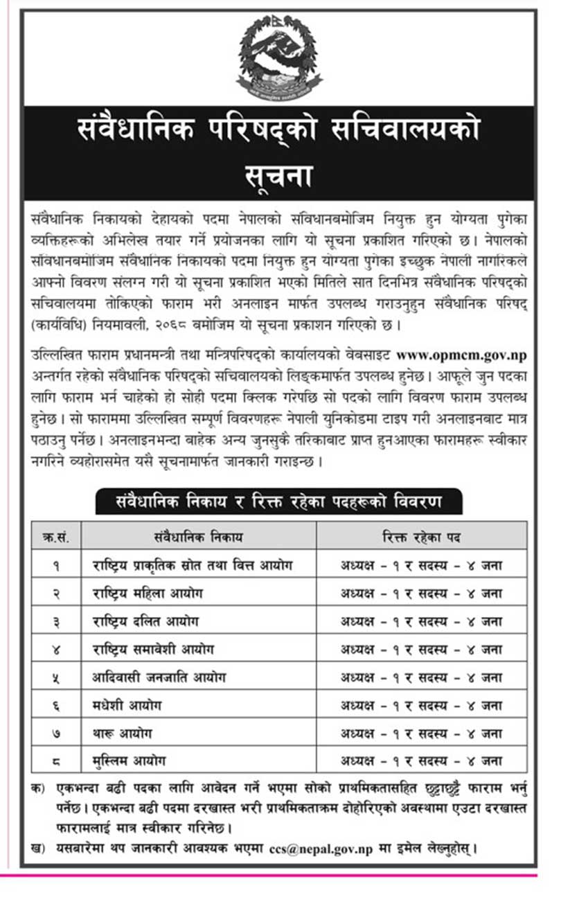 परिषदले विभिन्न ८ संवैधानिक आयोगमा रिक्त अध्यक्ष तथा सदस्य खुला प्रतिष्पर्धाबाट नियुक्ति गर्न प्रक्रिया शुरु गरेको हो । ८ संवैधानिक निकायमा अध्यक्ष र सदस्य गरी ४० जना आवश्यक छ ।