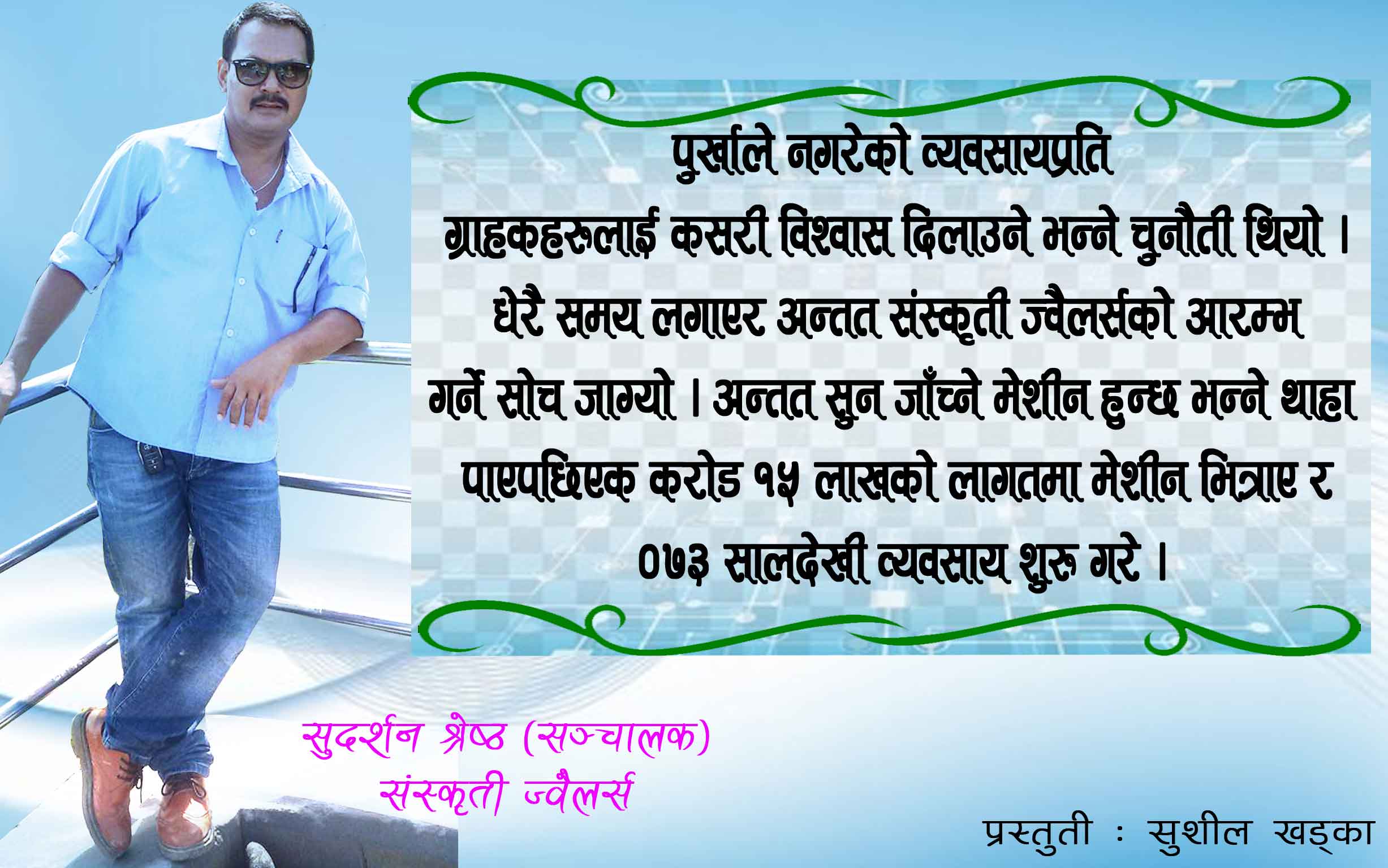 माइक्रो गाडीको स्थापित गरेपछि श्रेष्ठले वीरेन्द्रनगरमै पृथक व्यवसाय गर्ने योजना बुने । सुनचाँदी व्यवसाय शुरु गर्न उनले तीन वर्ष अनुसन्धान गरे । ‘पुर्खाले नगरेको व्यवसायप्रति ग्राहकहरुलाई कसरी विश्वास दिलाउने भन्ने चुनौती थियो’ श्रेष्ठ भन्छन्, ‘धेरै समय लगाएर अन्तत संस्कृती ज्वैलर्सको आरम्भ गर्ने सोच जाग्यो ।