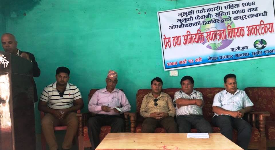 सुर्खेत । सरकारले ल्याएको नयाँ मुलुकी ऐन सहिंताले पत्रकारलाई अंकुश लगाएकोमा विरोध जनाइएको छ । नेपाल पत्रकार महासंघ सुर्खेतले प्रेस तथा अभिव्यक्ती स्वतन्त्रता विषयक अन्तरक्रियामा सहभागी वक्ताहरुले नयाँ मुलुकी संहिताले अंकुश लगाएकोमा विरोध जनाएका हुन् । उनीहरुले तत्काल मुलुकी संहितालार्इ संशाेधन गर्न माग पनि गरेका छन् ।