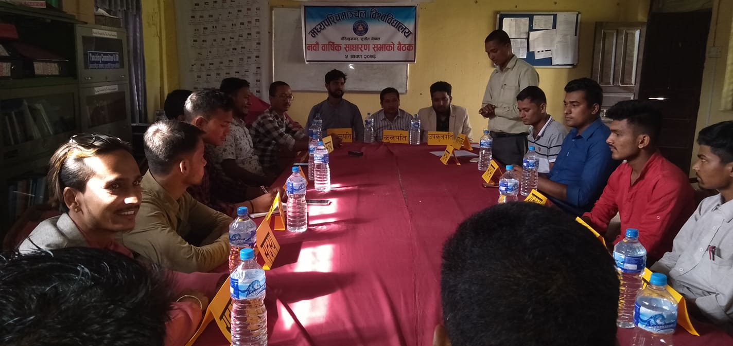 नेपाल कम्युनिष्ट पार्टी ९नेकपा० निकट विद्यार्थीहरुले विश्वविद्यालयको नवौं साधारण सभा वीरेन्द्रनगरमा मनाएका छन् । कुलपतिका रुपमा अनेरास्ववियुका पूर्व जिल्ला अध्यक्ष प्रेम खडका, सहकुलपतिका रुपमा जगत ढकाल, उपकुलपतिका रुपमा प्रभात पोखरेल र रजिष्ट्रारका रुपमा अनेरास्ववियु एमयु राष्ट्रिय कमिटी अध्यक्ष गगनसिंह ठकुरीले भूमिका निर्वाह गरे । सदस्य सचिव समेत रहेका ठकुरीले वार्षिक नीति, कार्यक्रम, बजेट सार्वजनिक गरे भने कुलपतिले सम्बोधन गर्दै सभा टुंग्याए ।