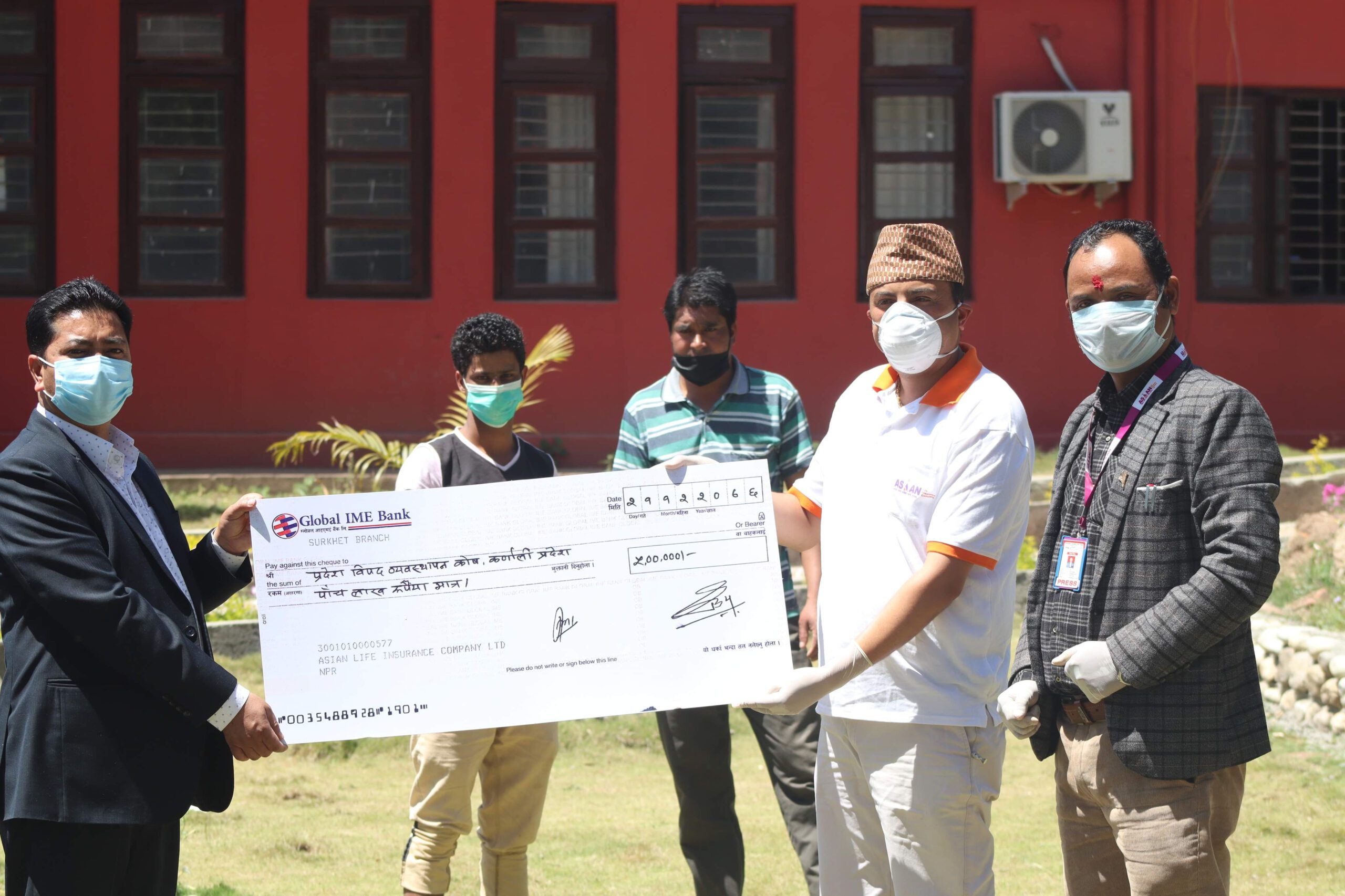 चैत्र२८, सुर्खेत ,विश्वव्यापी महामारीको रुपलिएको कोरोना भाइरस को संक्रमण्ँ रोकथाम,नियन्त्रण तथा उपचारको यथोचित व्यवस्थापनका लागि कर्णाली प्रदेश सरकार मुख्यमन्त्री तथा मन्त्रिपरिषद्को कार्यालयवाट मिति २०७६÷१२÷१४ मा प्रदेश विपद् व्यवस्थापन कोषमा स्वेच्छिक योगदानका लागि सार्वजनिक आव्हान गरिएकोमा यही मिति २०७६ चैत्र २१ गते एशियन लाइफ इन्स्योरेन्स कम्पनी लिमिटेडले १३ औं बर्ष प्रवेश गरेको अवसरमा संस्थागत सामाजिक उत्तरदायित्व अन्तर्गत कम्पनी,संचालक समिति तथा सम्पूर्ण कर्मचारीहरुको तर्फवाट सातवटै प्रदेश सरकारलाई रु.५ लाखका दरले कोरोना भाइरस रोकथाम,नियन्त्रण तथा उपचारको लागि रकम प्रदान गर्ने निर्णय भए बमोजिम मिति २०७६ चैत्र २७ गतेका दिन कर्णाली प्रदेश सरकार,आन्तरिक मामिला तथा कानून मन्त्री माननीय श्री नरेश भण्डारीज्यूलाई कम्पनीको तर्फबाट प्रदान गरिने रकम कम्पनीका सहायक महाप्रबन्धक एवं कर्णाली प्रदेश प्रमुख श्री विजय पराजुलीबाट रु.५ लाख रकमको चेक हस्तान्तरण गरिएको छ ।