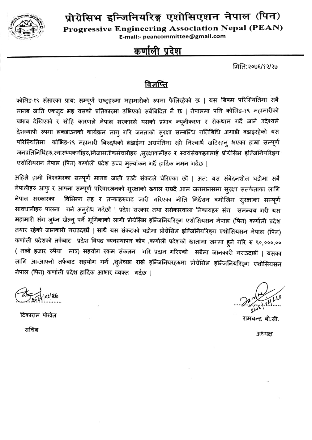 विश्वमा महामारीको रुपमा फैलिएको कोरोना भाइरस (कोभीड–१९) को रोकथाममा इन्जिनियरिङ्ग एशोसियशनले राहत रकम दिएको अध्यक्ष रामचन्द्र विसीले जानकारी दिए ।
