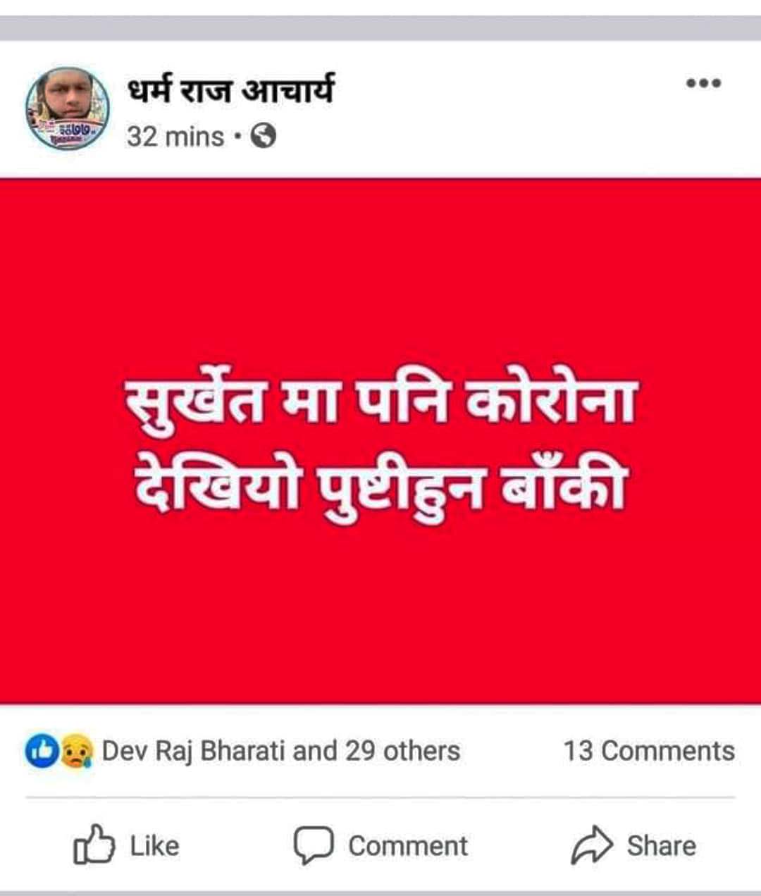 सुर्खेत । सामाजिक सञ्जाल फेसबुकमा कोरोना भाइरस (कोभीड–१९) बारे भ्रम फैलाउने एक जनालाई सुर्खेत प्रहरीले पक्राउ गरेको छ । वीरेन्द्रनगर–८ कालुञ्चोक बस्ने धर्मराज आचार्यलाई जिल्ला प्रहरी कार्यालय सुर्खेतले मंगलबार साँझ पक्राउ गरेको हो ।