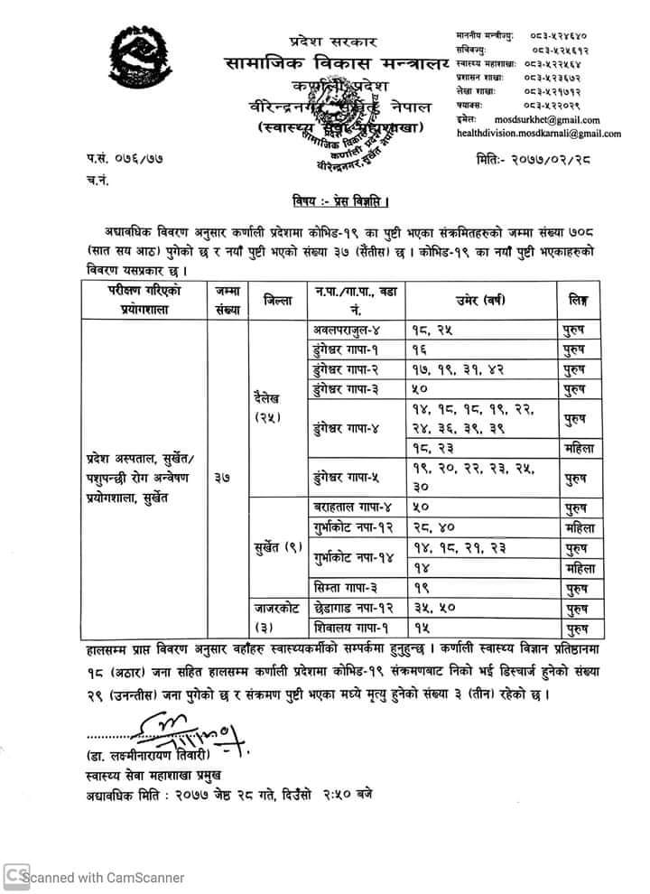 मंलबारसम्म कर्णाली प्रदेशमा संक्रमितको संख्या ६७१ पुगेको थियो । बुधबार ३७ जना नयाँ संक्रमित भेटिएपछि कर्णालीमा कोरोना संक्रमितको संख्या ७०८ पुगेको हो । बुधबार दैलेखका २५ सुर्खेतमा ९र जाजरकोटका ३ जना नयाँ संक्रमित भेटिएको सामाजिक विकास मन्त्रालयका स्वास्थ्य सेवा महाशाखाका प्रमुख लक्ष्मीनारायण तिवारीले जानकारी दिए ।