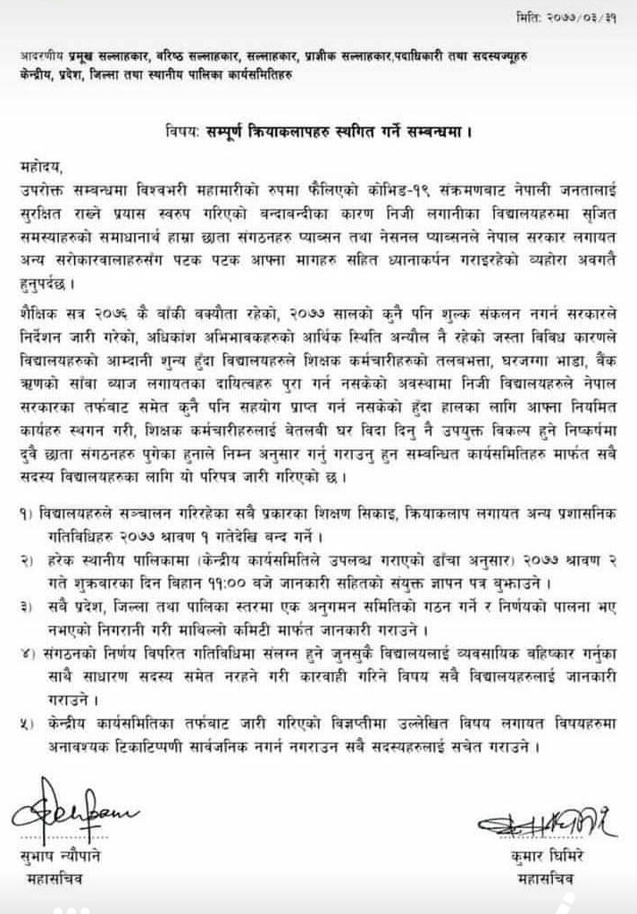 नवराज सुवेदी नेपालगन्ज – बाँकेमा आज इस्टु संगठनले आयोजना गरेको कार्यक्रममा, प्याब्सन र एनप्याब्सनले संयुक्त रुपमा विज्ञप्ति निकालेको छ।संस्थाले जारी गरिएको विज्ञप्तिमा साउन १ गते देखि बेतलबी बस्नुपर्ने बाध्यता बनाएको र भावनात्मक सम्बन्धमा ठेस पुर्याएको विरुद्धमा इस्टुले घोर बिरोध गरेको हाे।