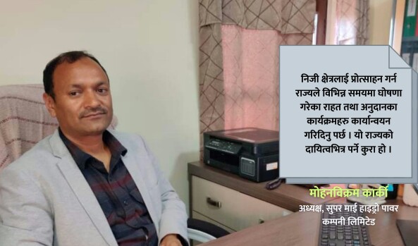 अहिलेसम्म आइपुग्दा निजी क्षेत्रको लगानी क्षमता निरन्तर बढिरहेको छ । आज सय मेगावाटसम्मका आयोजना निर्माण गर्न निजी क्षेत्र सक्षम छ । लगानीमैत्री वातारण भएमा लगानी सहज हुन्छ । तर, यसका लागि निजी क्षेत्रलाई प्रोत्साहन गर्न राज्यले विभिन्न समयमा घोषणा गरेका राहत तथा अनुदानका कार्यक्रमहरु कार्यान्वयन गरिदिनु पर्छ । यो राज्यको दायित्वभित्र पर्ने कुरा हो ।