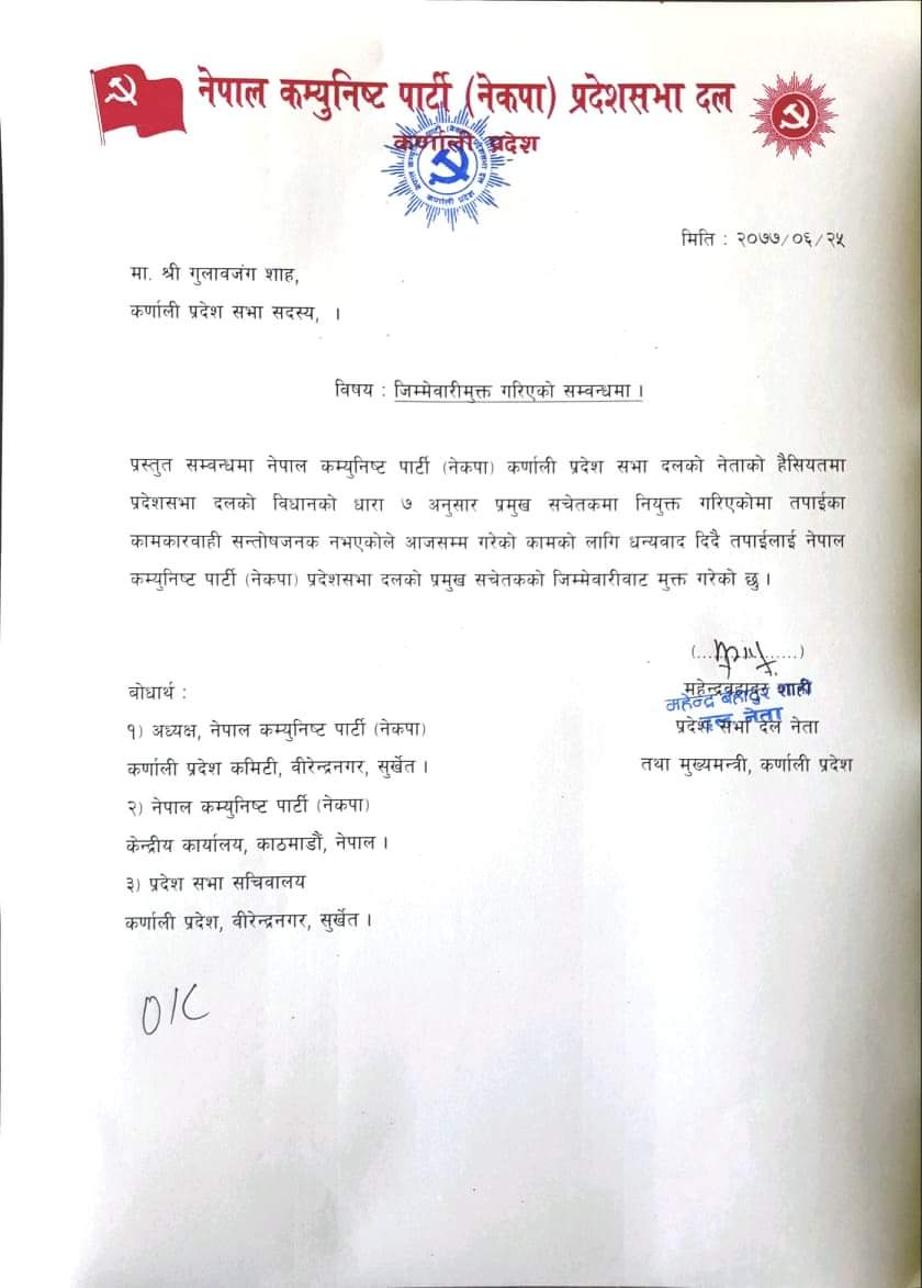 कर्णाली प्रदेश प्रदेश सभा दल नेता महेन्द्रबहादुर शाहीले कामकारवाही सन्तोषजनक नभएकाले हटाईएको जिम्मेवारीबाट हटाईएको पत्रमा उल्लेख गरेका छन् ।