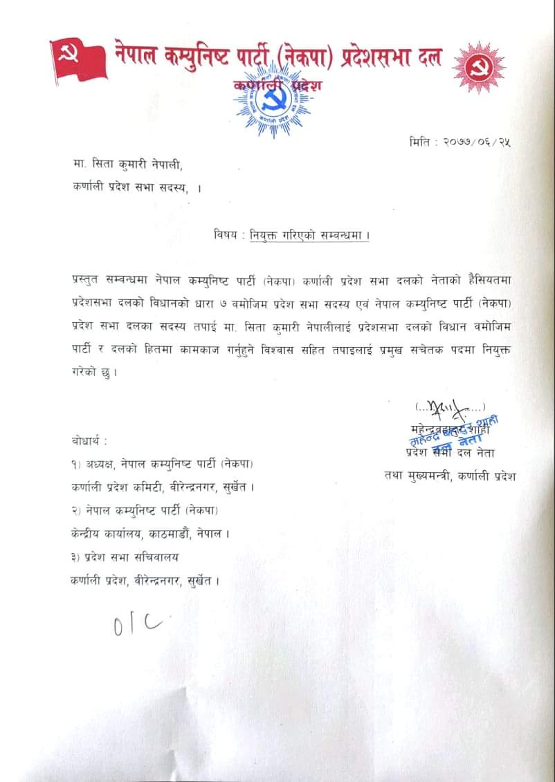 त्यस्तै प्रमुख सचेतकमा सांसद सिता कुमारी नेपालीलाई नियुक्त गरेको अर्को पत्रमा उल्लेख गरिएको छ ।