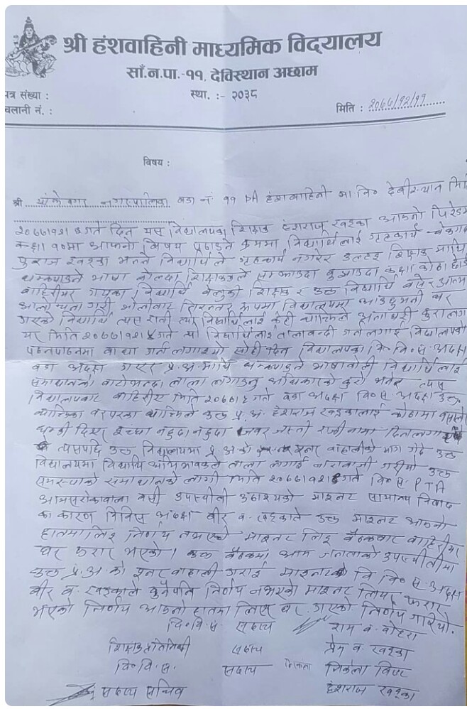 एकेन्द्र महताअछाम। साँफेबगर नगरपालिका वडा नम्बर ११ देविस्थान स्थित हंस बाहिनी माध्यामिक विद्यालयका प्रधानाध्यापक हंसराज खड्काले स्वैच्छिक नभएर राजनीतिक दवावका कारण प्रधानाध्यापकबाट राजीनाम दिएको बताउनु भएको छ। हंस वाहिनी माध्यामिक विद्यालयद्धारा बुधबार जारी गरिएको प्रेस विज्ञप्तिमा विद्यालय व्यवस्थापन समितिका केहि व्यक्ति, वडा अध्यक्ष गणेश खड्काको र केही राजनीतिक दलको दवावका कारण आफूले प्रधानाध्यापकबाट राजीनामा दिएको उल्लेख गरिएको छ। दबाबका कारण राजीनामा दिएको भए पनि विद्यालय व्यवस्थापन समितिको वहुमत पक्षले राजिनामा स्वीकृत नगरेको विज्ञप्तिमा उल्लेख गरिएको छ। सामान्य घट्नालाई राजनीतिक करण गरेर आफू निकट व्यक्तिलाई प्रधानाध्यापक बनाउनको लागि दवाव दिए पछि राजीनामा दिएको प्रधानाध्यापक खड्काको भनाई रहेको छ। तर वडा अध्यक्ष खड्काले भने राजीनामा दिने नदिने भन्नेमा आफ्नो कुनै संलग्नता नरहेको दावि गर्नु भएको छ।
