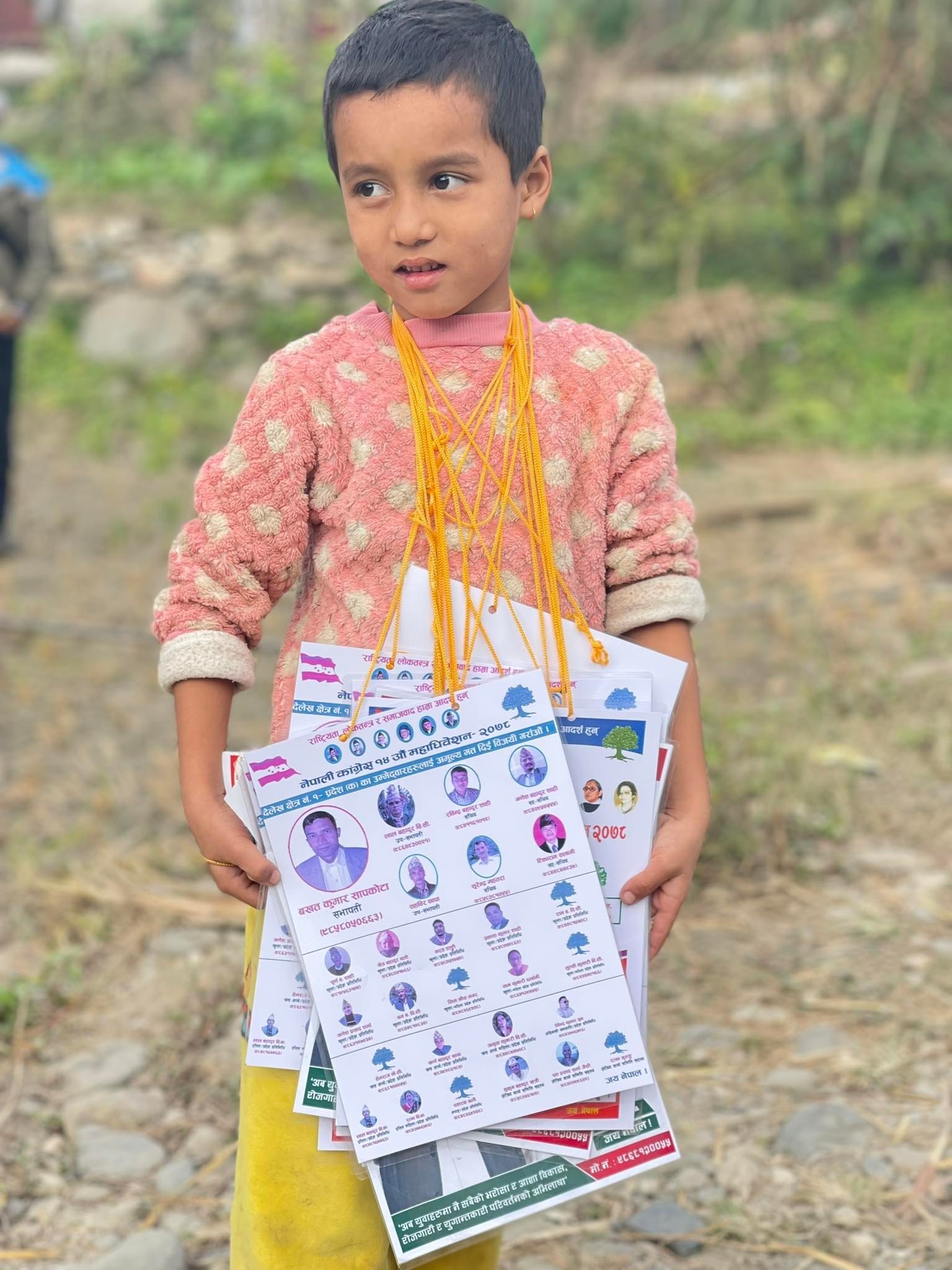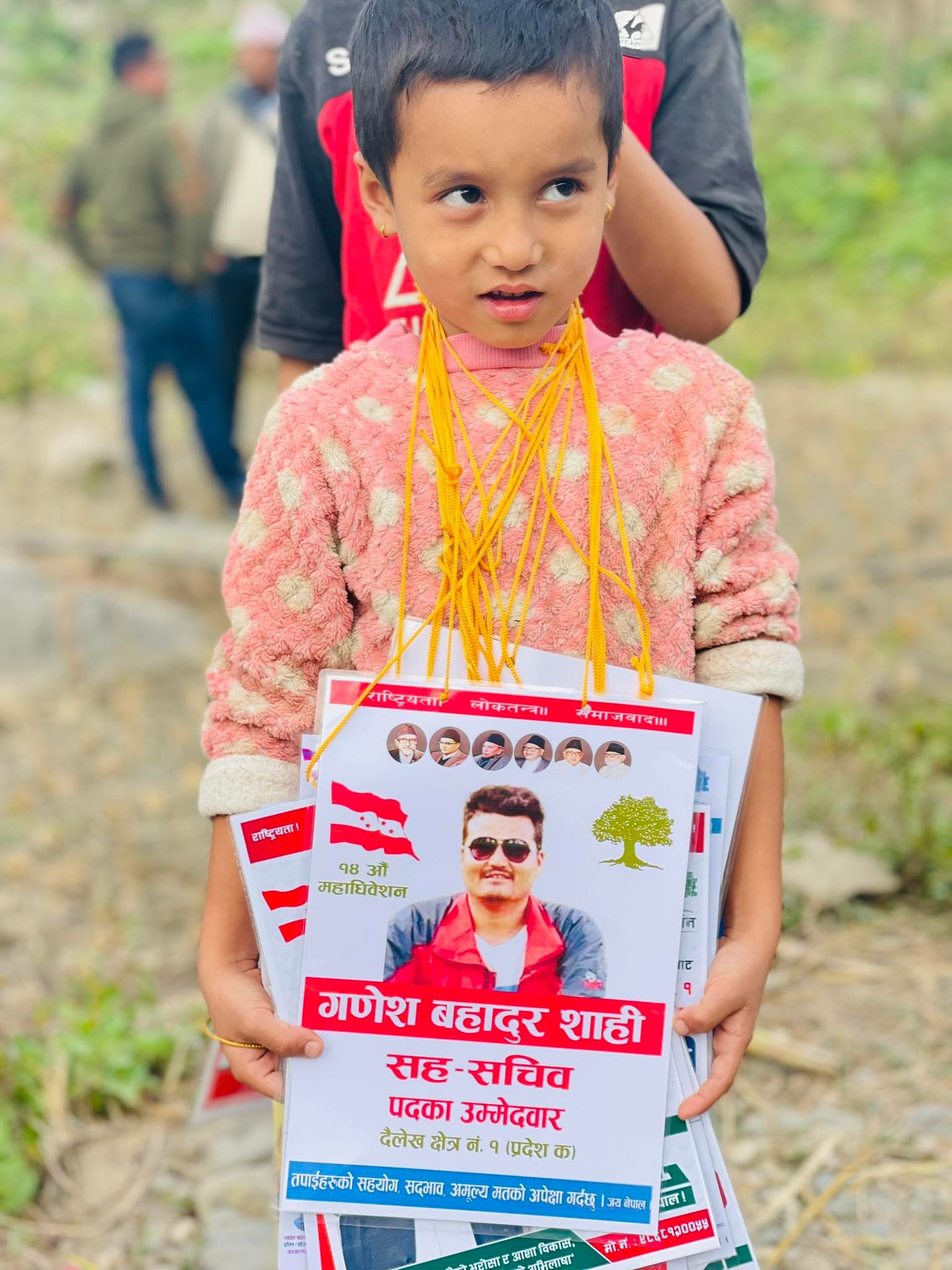 नेपाली काँग्रेस दैलेख निर्वाचन क्षेत्र नम्बर १ (क) प्रदेश निर्वाचनमा सह सचिव उम्मेदवार गणेश बहादुर शाहीको प्रचारमा उनका ७ वर्षका छोरा आदित्य शाही देखिए । माथिल्लो डुंगेश्वरमा भएको निर्वाचनमा छोरा आदित्य घाँटीमा बाबाको चुनावी प्रचार सामग्री लिएर हिँडेका थिए । राजनीतिबारे अनविज्ञ आदित्य बाबाको चुनावी प्रचार लिएर चुनावी माहोलमा रौनकता थपिएको थियो । शुक्रबार अबेर चुनाव मतदान भएको थियो । दुई विचार समुह संस्थापनबाट निराजन खत्री र संस्थापन इतरबाट बखत सापकोटा प्रतिस्पर्धा छ ।