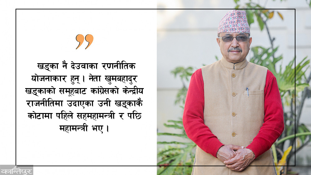 त्यसो त देउवा समूहमा उपसभापति विमलेन्द्र निधिले सभापतिमा लड्ने घोषणा गरेपछि खड्काको भूमिका बढेको हो । ‘अहिले हाम्रो समूहको राणनीतिक कमान्डर नै उहाँ हो । उहाँको परामर्शमा सभापतिज्यूले धेरै निर्णय लिनुहुन्छ,’ देउवा समूहका ती नेताले भने ।