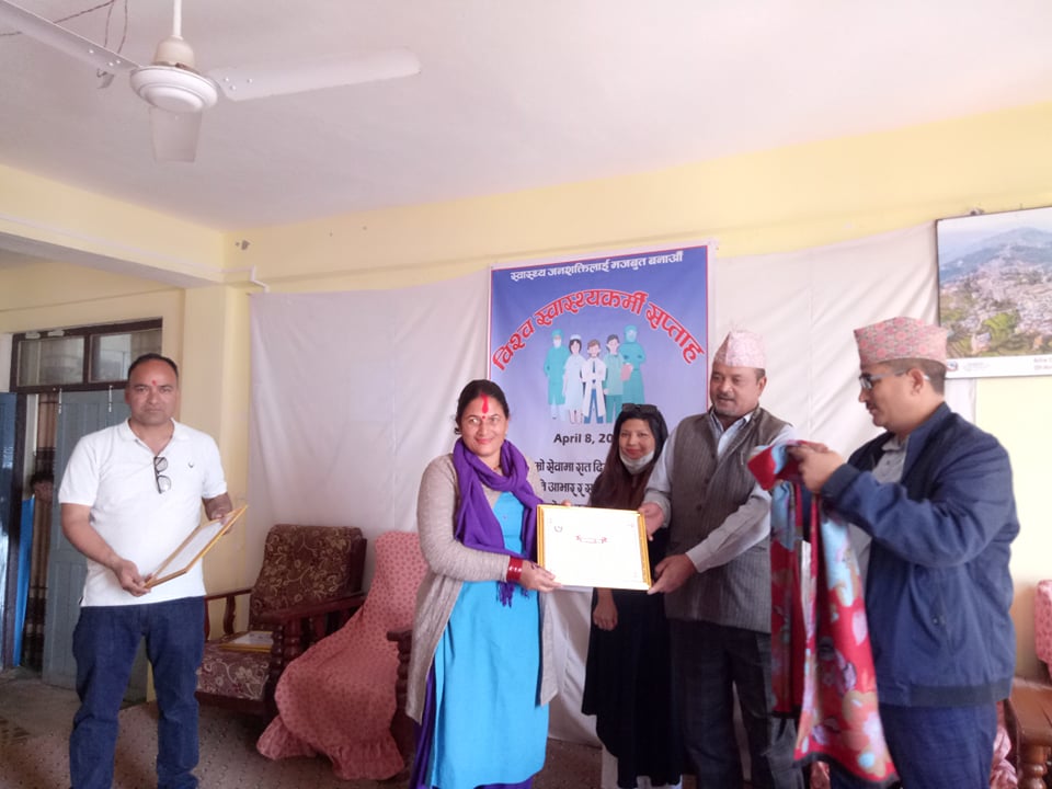 दैलेख –नारायण नगरपालिका दैलेखले बिश्व स्वास्थ्यकर्मि सप्ताहको अवसरमा कोभिड१९- को महामारीमा अग्रपंक्तिमा खटिएर काम गर्ने स्वास्थ्यकर्मीलाई सम्मान गरेको छ। नारायण नगरपालिका भित्र बिभिन्न स्वास्थ्य चौकीमा कार्यरत ९ जना स्वास्थ्यकर्मीलाई शुक्रबार उपहार सामाग्री ,प्रमाणपत्रसहित दोसल्ला ओढाएर सम्मान गरिएको नारायण नगरपालिका स्वास्थ्य शाखा दैलेखका सह संयोजक लाल बहादुर खड्काले बताए।नगरपालिकाले सिफारिस गरेका स्वास्थ्यकर्मीहरूमध्ये छनौट गरेर उत्कृष्टलाई सम्मान गरिएको स्वास्थ्य शाखा सह- संयोजक खड्काले जानकारी दिए। गत आर्थिक वर्ष यतादेखि स्वास्थ्य क्षेत्रमा उत्कृष्ट कार्य सम्पादन गरेका र कोभिड–१९ को प्रतिकार्यमा महत्वपूर्ण भूमिका खेलेका स्वास्थ्यकर्मीहरूलाई सम्मान गरिएको जनाएको छ।