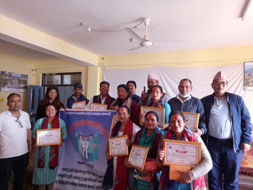 दैलेख –नारायण नगरपालिका दैलेखले बिश्व स्वास्थ्यकर्मि सप्ताहको अवसरमा कोभिड१९- को महामारीमा अग्रपंक्तिमा खटिएर काम गर्ने स्वास्थ्यकर्मीलाई सम्मान गरेको छ। नारायण नगरपालिका भित्र बिभिन्न स्वास्थ्य चौकीमा कार्यरत ९ जना स्वास्थ्यकर्मीलाई शुक्रबार उपहार सामाग्री ,प्रमाणपत्रसहित दोसल्ला ओढाएर सम्मान गरिएको नारायण नगरपालिका स्वास्थ्य शाखा दैलेखका सह संयोजक लाल बहादुर खड्काले बताए।नगरपालिकाले सिफारिस गरेका स्वास्थ्यकर्मीहरूमध्ये छनौट गरेर उत्कृष्टलाई सम्मान गरिएको स्वास्थ्य शाखा सह- संयोजक खड्काले जानकारी दिए। गत आर्थिक वर्ष यतादेखि स्वास्थ्य क्षेत्रमा उत्कृष्ट कार्य सम्पादन गरेका र कोभिड–१९ को प्रतिकार्यमा महत्वपूर्ण भूमिका खेलेका स्वास्थ्यकर्मीहरूलाई सम्मान गरिएको जनाएको छ।
