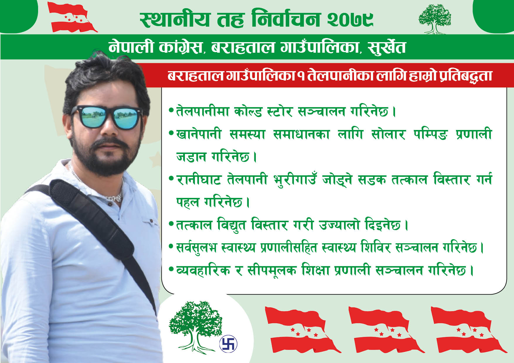बराहताल, २१ बैशाख । बराहताल गाउँपालिका–१ मा तेलपानीमा कोल्ड स्टोर सञ्चालन गर्ने अध्यक्ष पदका उम्मेदवार भिम भण्डारीले प्रतिवद्धता जनाएका छन् । नेपाली कांग्रेसका तर्फबाट अध्यक्ष पदमा उम्मेदवार भण्डारीले आज तेलपानीको चुनावी आमसभालाई सम्बोधन गर्दै यस्तो बताएका हुन् । बराहताल गाउँपालिकालाई कृषिमा आत्मनिर्भर बनाई बजारीकरणका लागि व्यवस्थित गर्नुका साथै मौसम अनुसार उत्पादित वस्तु भण्डारण गर्न तेलपानीमा कोल्ड स्टोर सञ्चालन गर्ने उम्मेदवार भण्डारीले प्रतिवद्धता जनाए ।