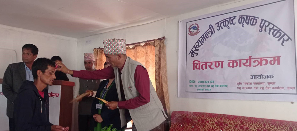 जुम्ला — जुम्लाका १४ जना किसान पुरस्कृत भएका छन् । पशु अस्पताल तथा पशु सेवा कार्यालय जुम्ला र कृषि विकास कार्यालय जुम्लाले गरेको मूल्यांकनमा किसानहरु पुरस्कृत भएका हुन् । उनीहरु सबैले मुख्यमन्त्री उत्कृष्ट कृषक पुरस्कार पाए ।