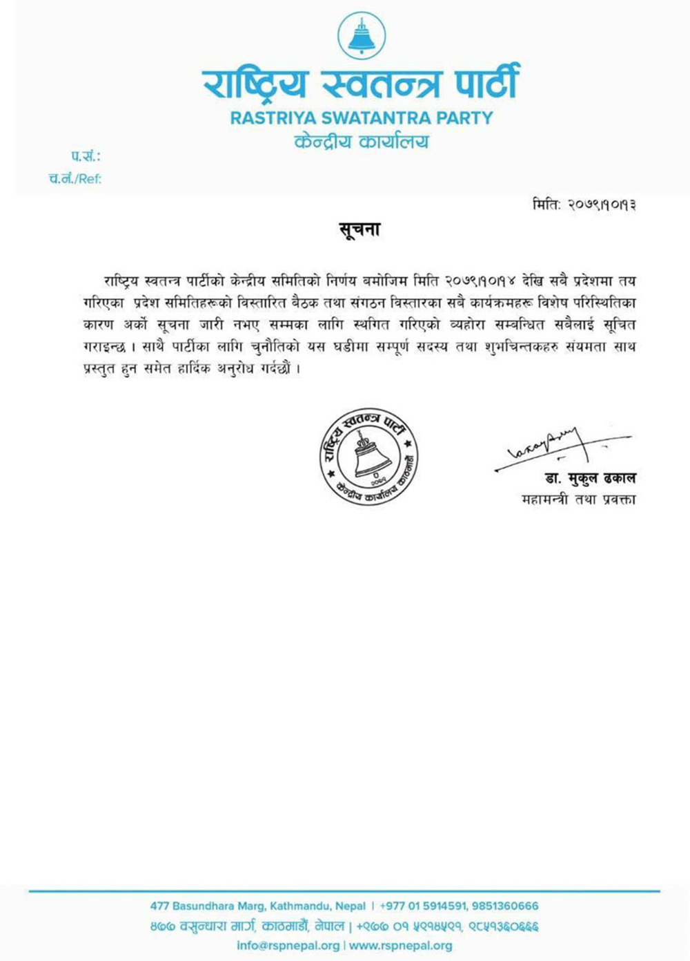 ‘राष्ट्रिय स्वतन्त्र पार्टीको केन्द्रीय समितिको निर्णय बमोजिम मिति २०७९/१०/१४ देखि सबै प्रदेशमा तय गरिएका प्रदेश समितिहरुको विस्तारित बैठक तथा संगठन विस्तारका सबै कार्यक्रमहरु विशेष परिस्थितिका कारण अर्को सूचना जारी नभएसम्मका लागि स्थगित गरिएको व्यहोरा सम्बन्धित सबैलाई सूचित गराइन्छ,’ सूचनामा लेखिएको छ,’साथै पार्टीका लागि चुनौतीको यस घडीमा सम्पूर्ण सदस्य तथा शुभचिन्तकहरु संयमता साथ प्रस्तुत हुनसमेत हार्दिक अनुरोध गर्दछौं ।’